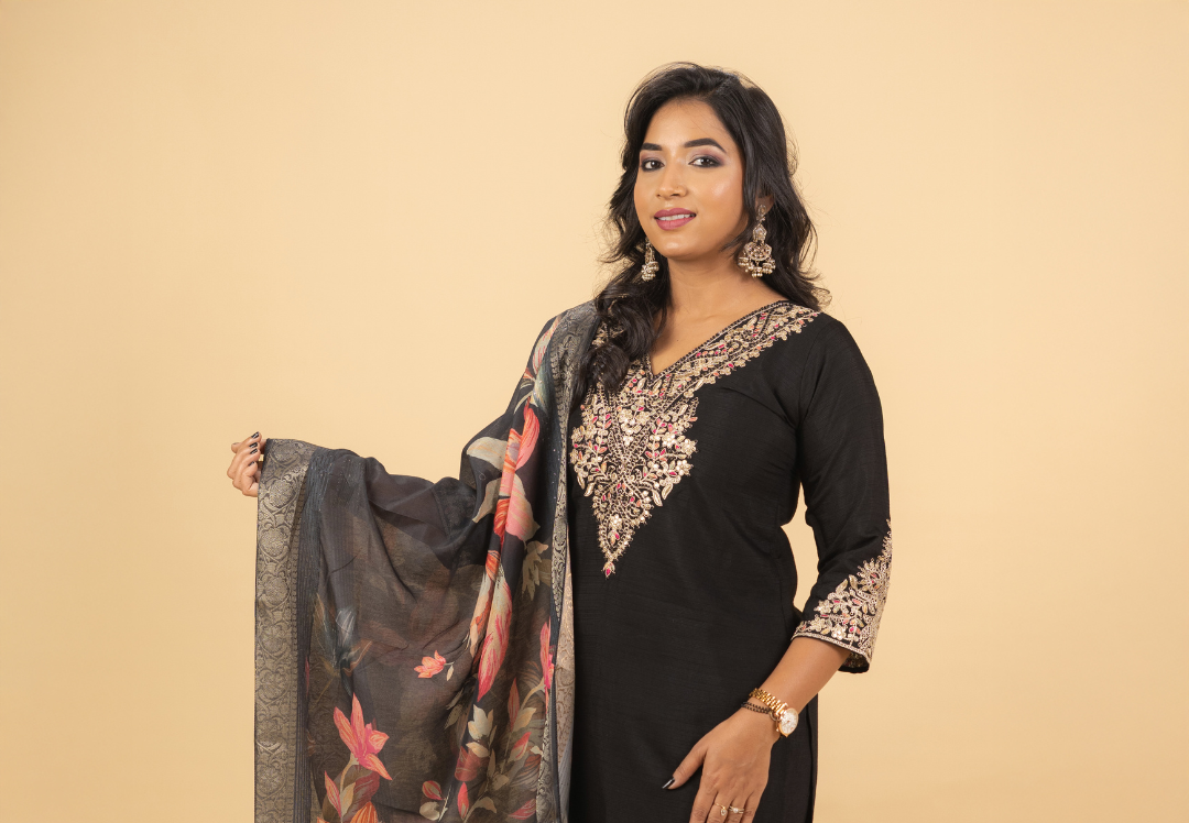 Classic black meets elegant embroidery in this beautifully crafted suit set. Featuring detailed ivory threadwork on the neckline, sleeves, and hem, the outfit is elevated with a soft floral-printed dupatta for a feminine touch. Perfect for festive evenings and graceful celebrations.