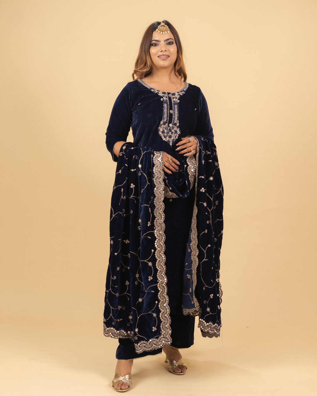 Luxurious and regal, this Midnight Blue Velvet Suit Set features rich thread and mirror embroidery across the neckline, sleeves, and dupatta. The plush fabric drapes elegantly, making it a perfect choice for winter weddings, evening festivities, or grand celebrations.